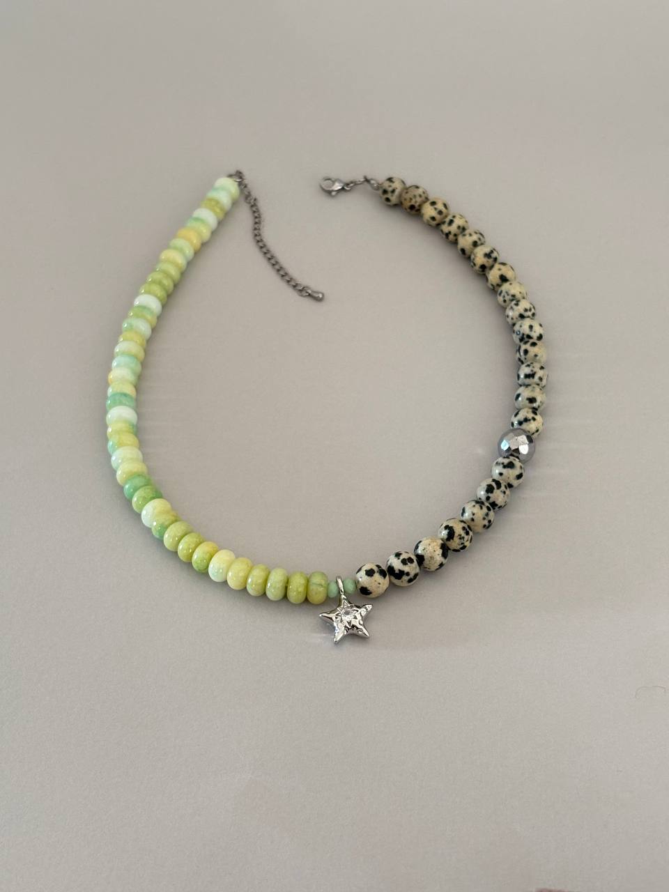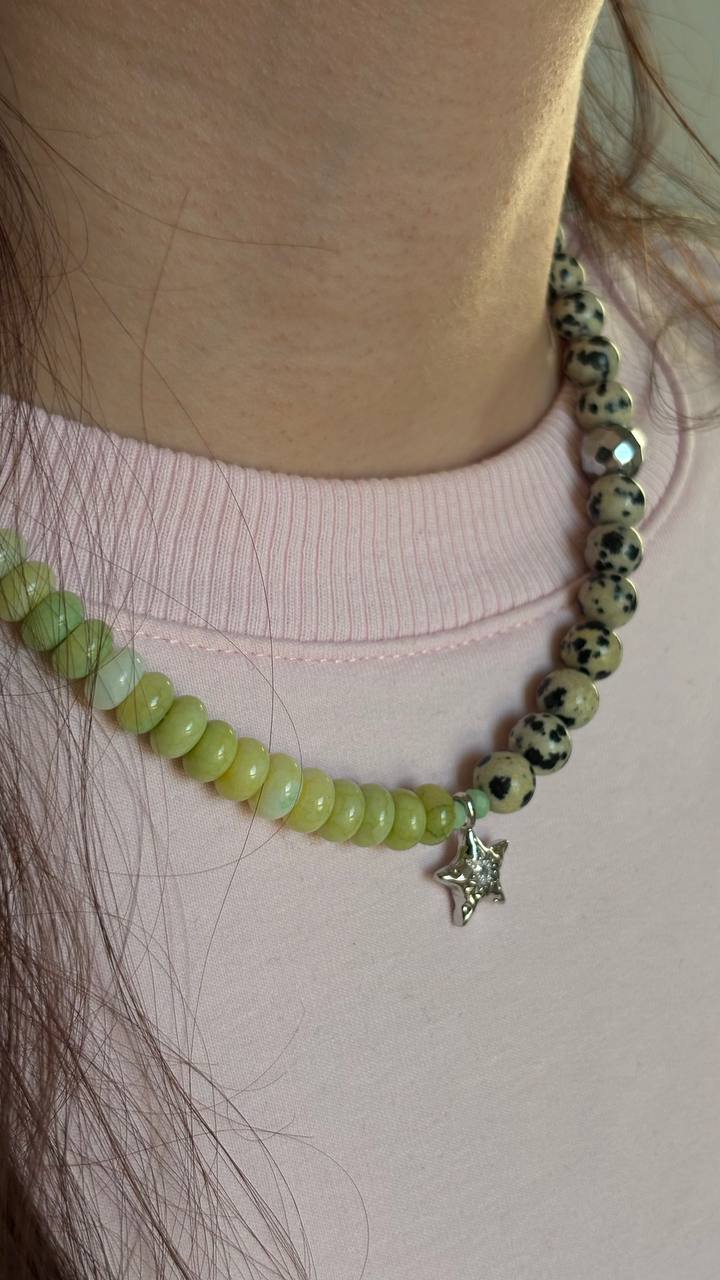• wykonany naszyjnik ze szklanych i naturalnych kamieni