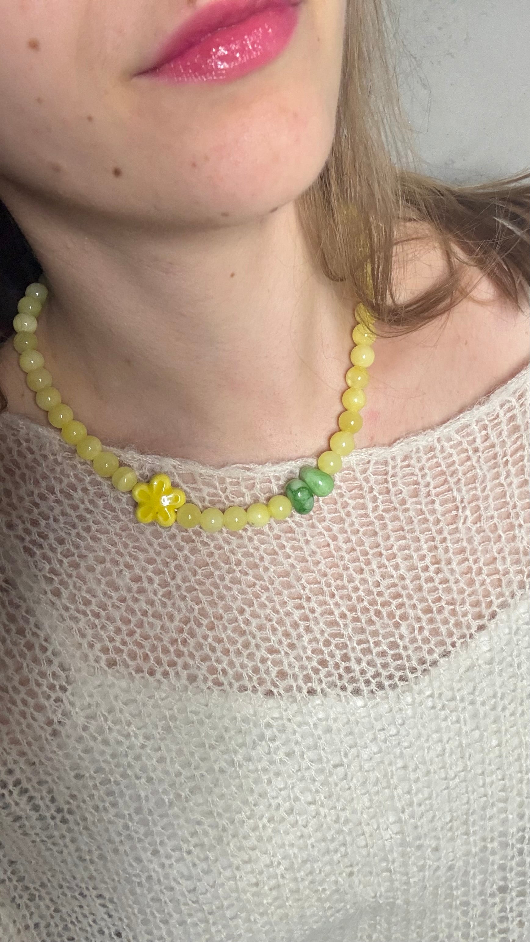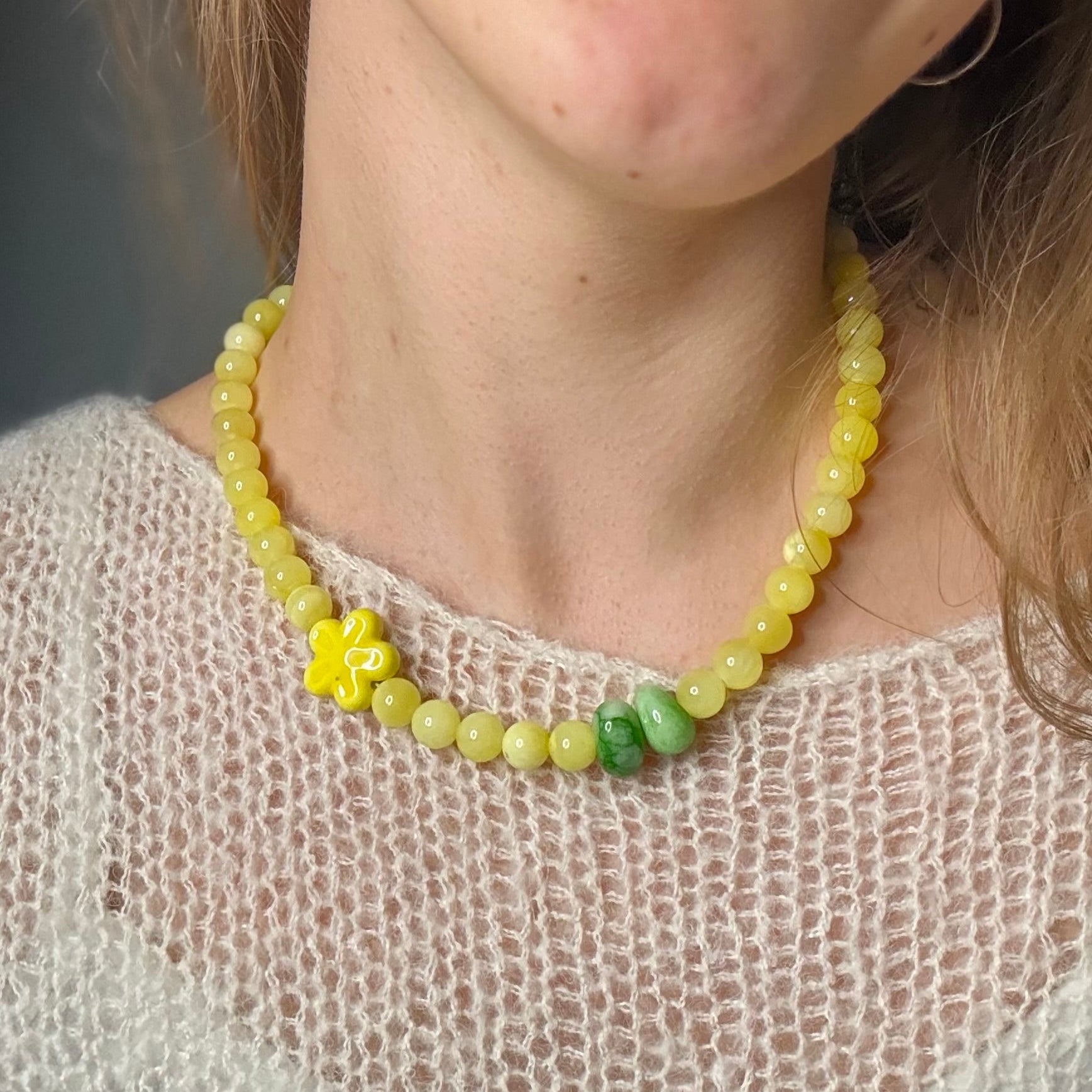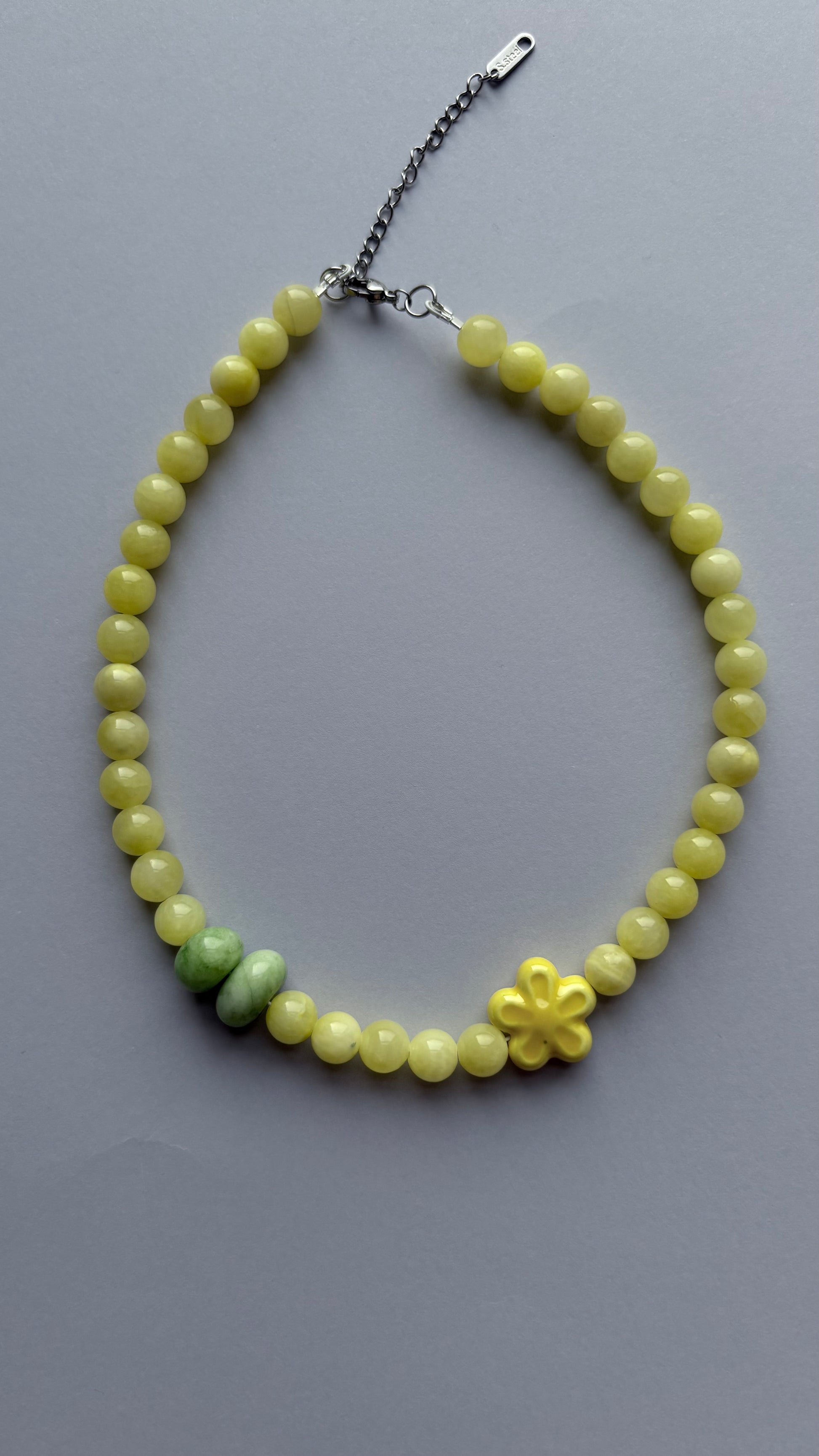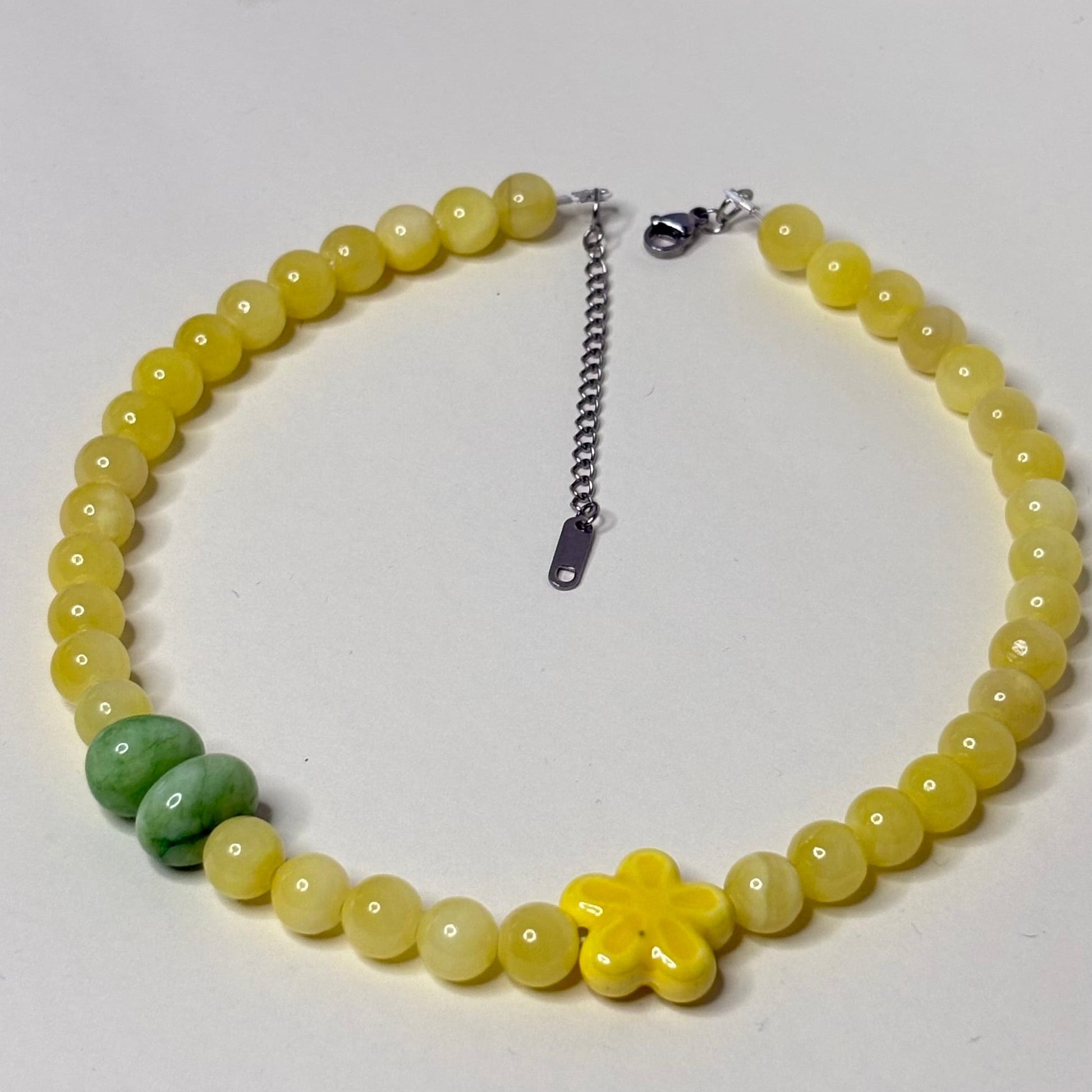 Słoneczne, żółte koraliki w połączeniu z ceramicznym kwiatem w ciepłym odcieniu tworzą kompozycję pełną światła i pozytywnej energii. Zielone kamienne akcenty dodają naturalnej świeżości i subtelnej harmonii.