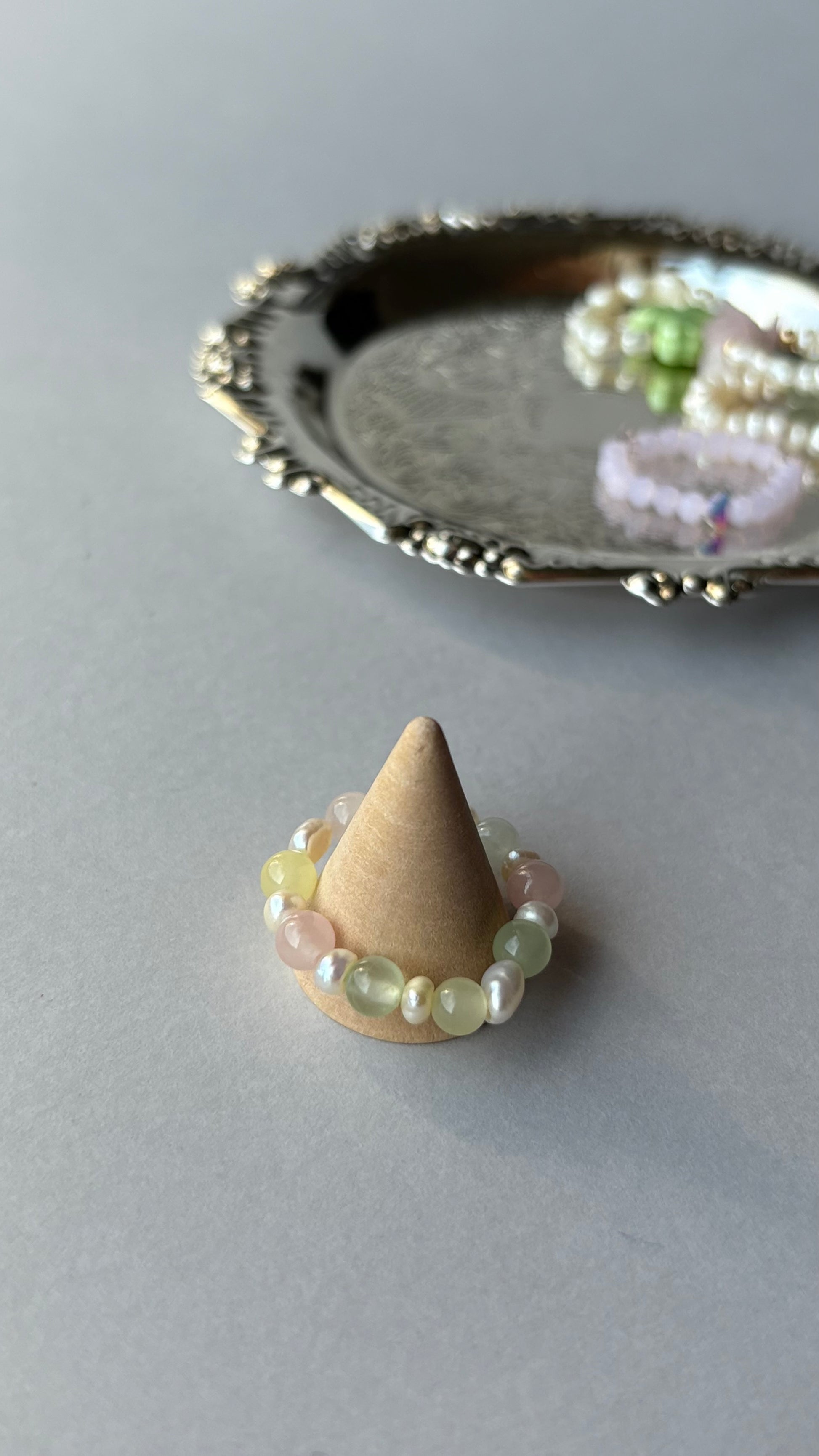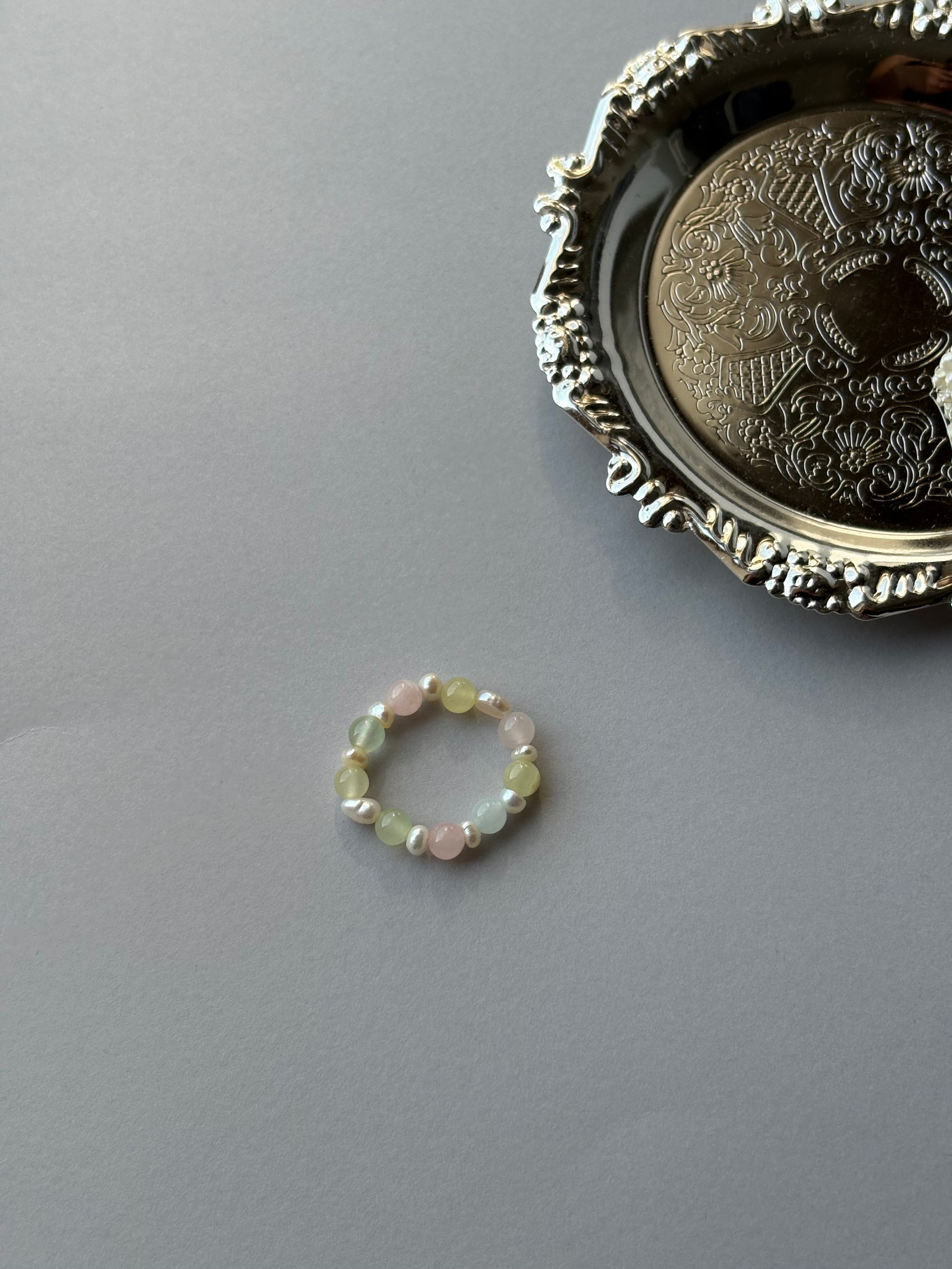 Pastelowe kamienne koraliki w odcieniach zieleni i różu w połączeniu z delikatnymi naturalnymi perłami tworzą subtelną i harmonijną kompozycję. Jasne kolory nadają pierścionkowi lekkości oraz świeżego, naturalnego charakteru.