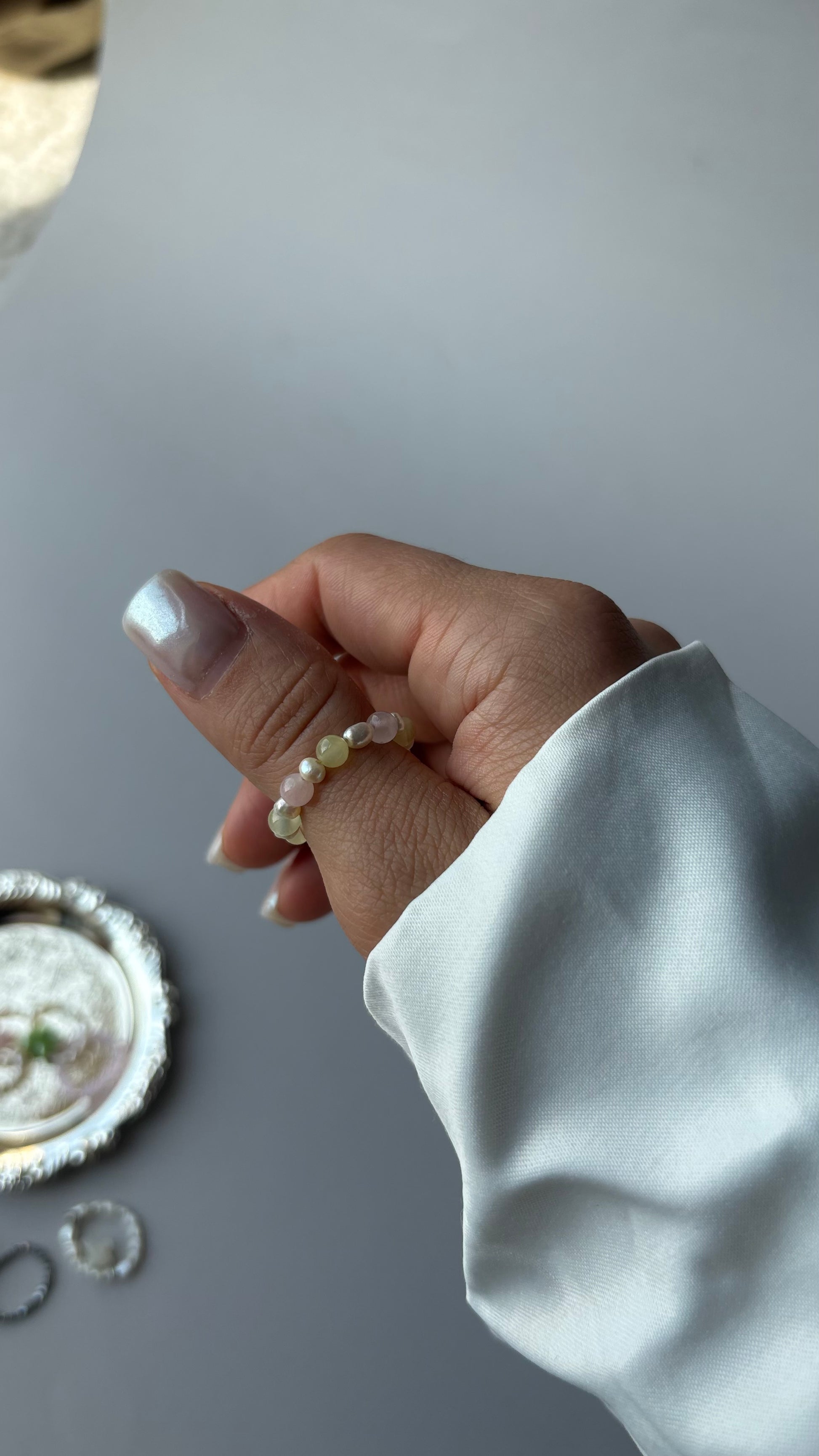 To ręcznie wykonany pierścionek inspirowany spokojnymi tonami natury. Połączenie kamieni i pereł podkreśla delikatność oraz elegancję, tworząc biżuterię, która przyciąga uwagę swoją prostotą i miękką kolorystyką.